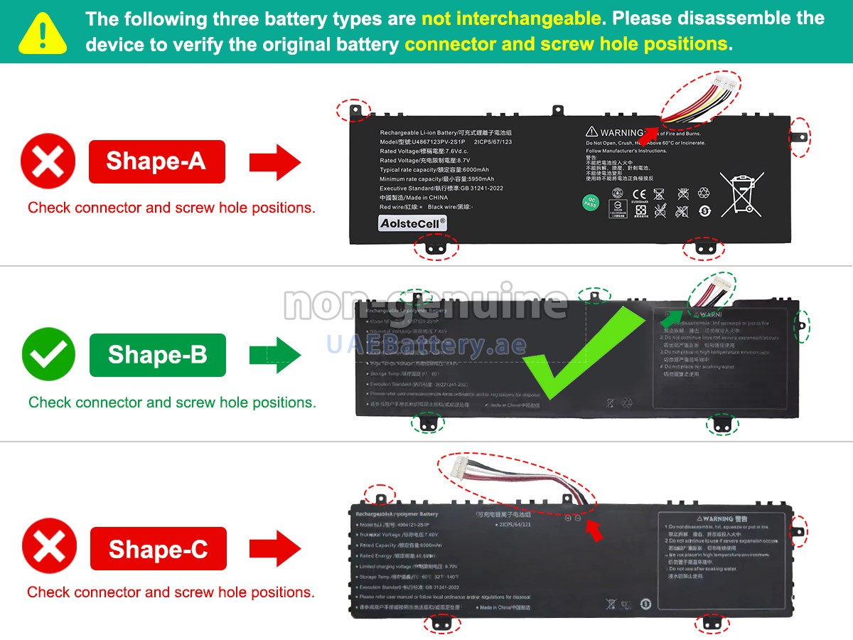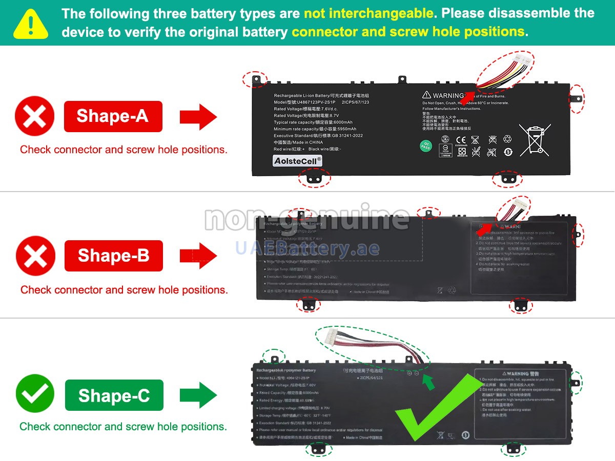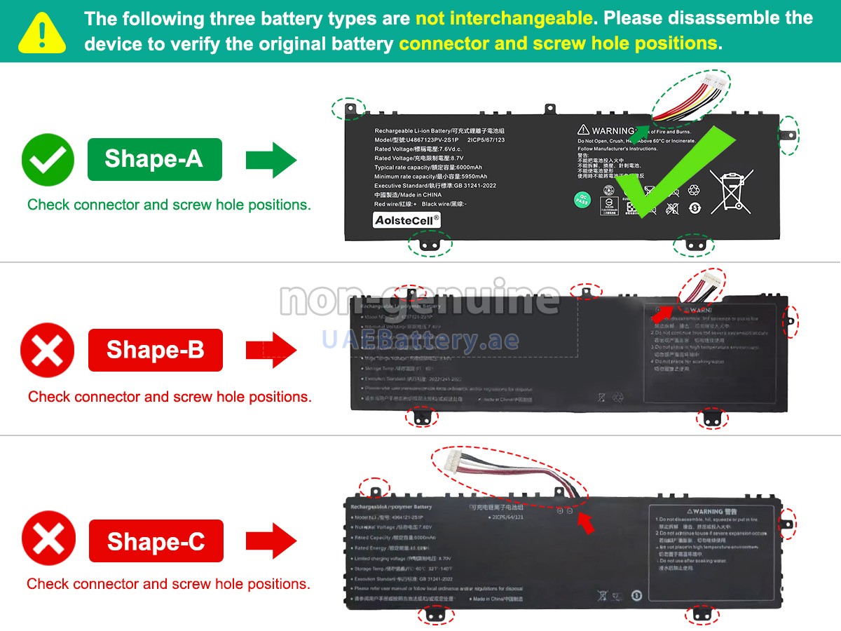 2 Compare the voltage and capacity of the battery with our Acer 4964121-2S1P battery, and check that the battery interface and shape are the same as the pictures on our website.