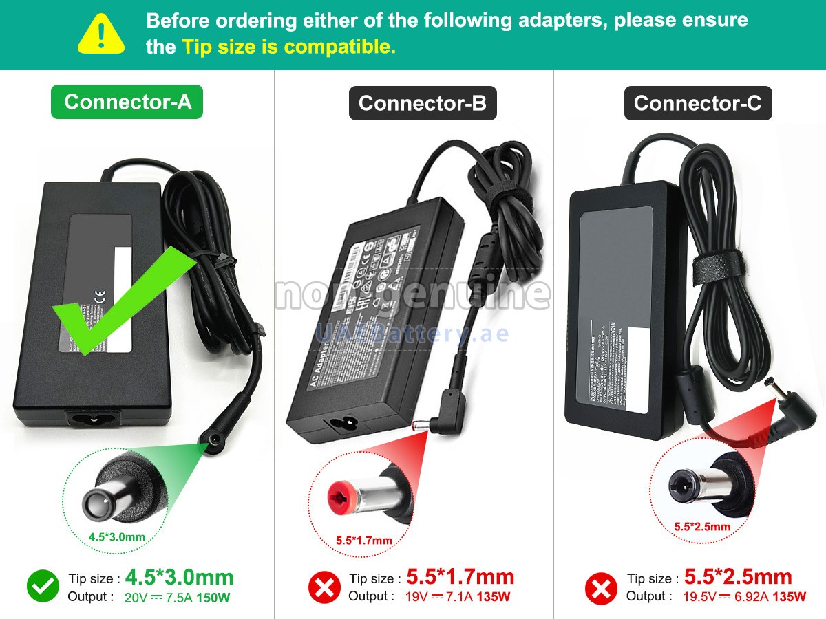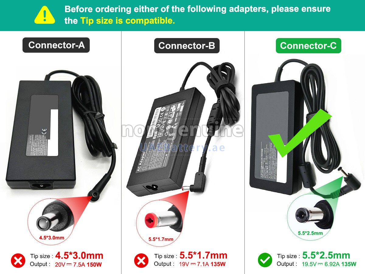 A: Just focus on the output parameters and connector type(or size). The output voltage should be the same as your original adapter or within 1V, and the output current should be slightly greater than or equal to your original AC adapter for MSI A18-135P1A. As for the connector type, make sure it can be plugged into the charging port of your device. If you are unable to determine the connector size, please Contact Us to let us know your device model.