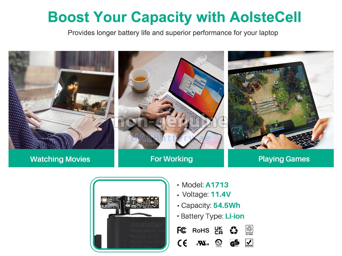 A: All of the batteries sold on UAEbattery are genuine OEM replacement batteries. They use the high quality battery cells and smart chips from famous factories, and the actual use effect is the same as the original battery, even higher than the original. In this way, the brand premium is eliminated, and the quality is not compromised. In fact, the original MLL42LL batteries are also assembled using different third-party accessories, but in the end, it affixed its own brand trademark on the battery. At UAEbattery, you can buy higher quality products at a more affordable price!