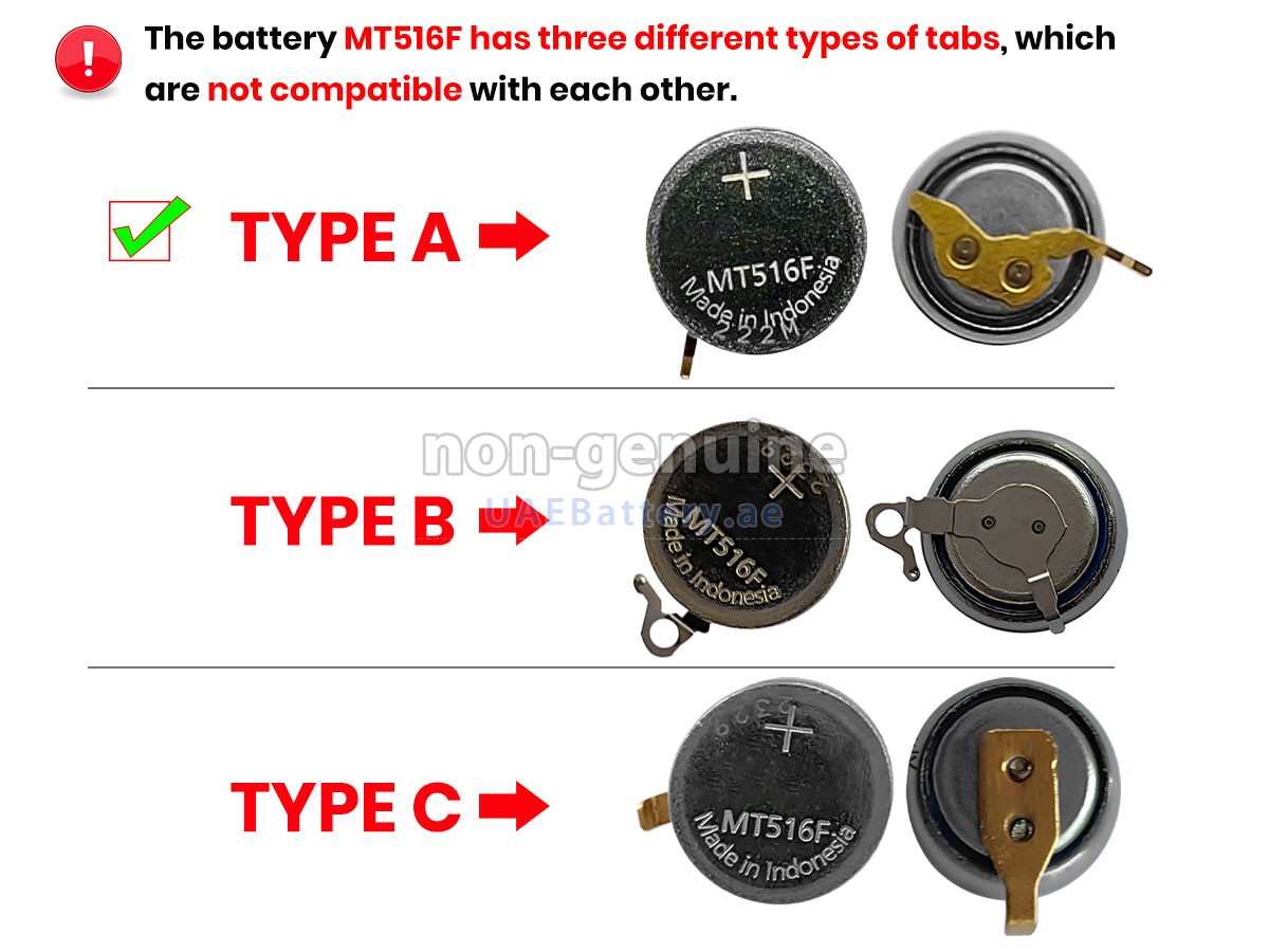 The battery MT516F has three different types of tabs, which are not compatible with each other. 1 cells | - For CITIZEN MT516F