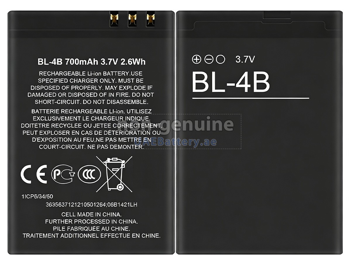 This Nokia BL-4B replacement battery is consistent with the original manufacturer's specifications and is 100% compatible with your Nokia device. It can match or exceed the original BL-4B battery in performance and user experience.